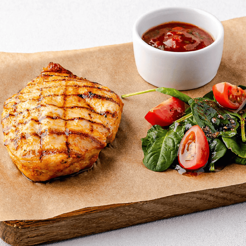 куряче філе, бейбі шпинат, помідори черрі, соус італьяно, соус вінегрет