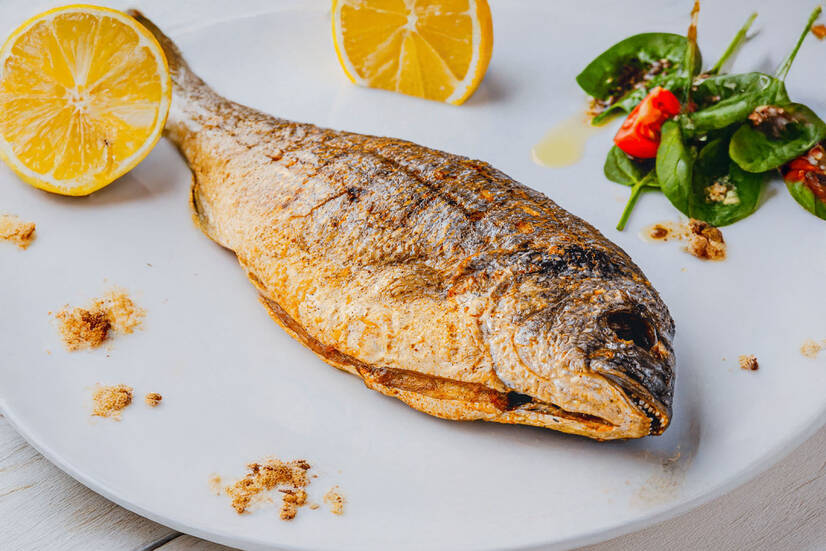 Ціна вказана за 100 г сирої риби (середня вага 300-400 г). Готуємо на грилі та подається з бебі шпинатом, черрі у фірмовому соусі Вінегрет