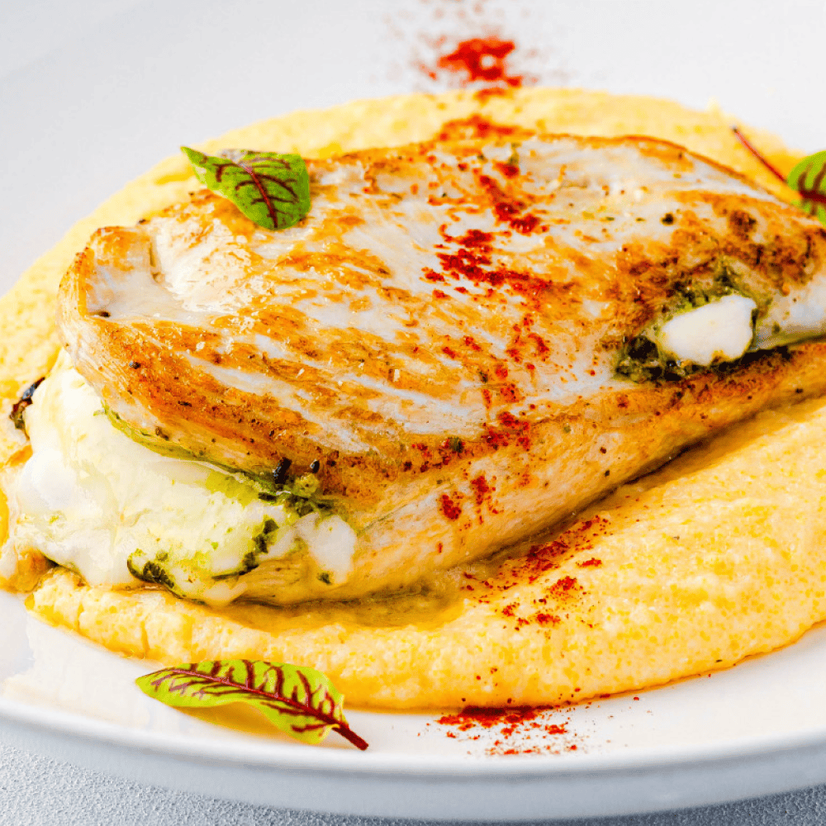 соус песто, вʼялені томати, моцарела, шпинат, подається на поленті з додаванням пармезану