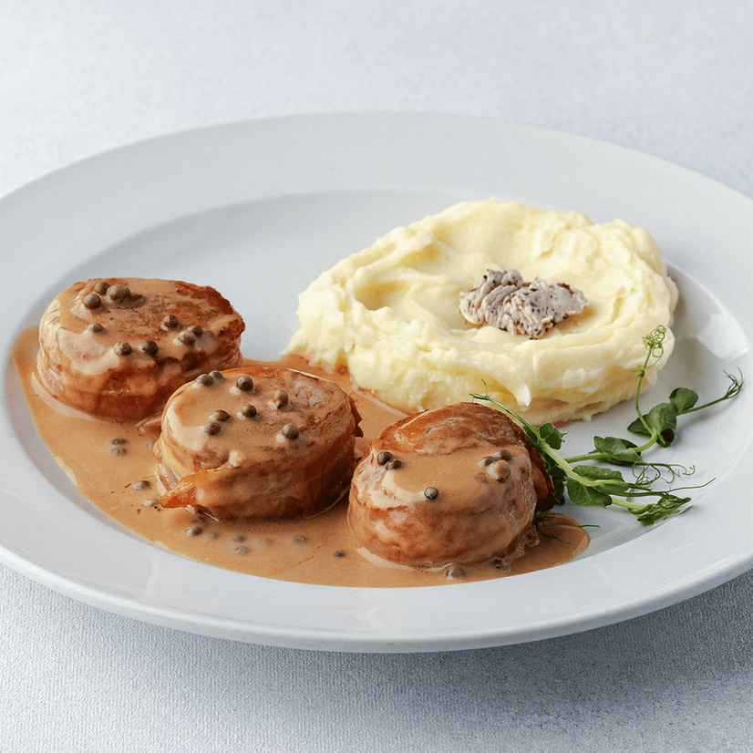 У беконі з перцевим соусом та картопляним пюре