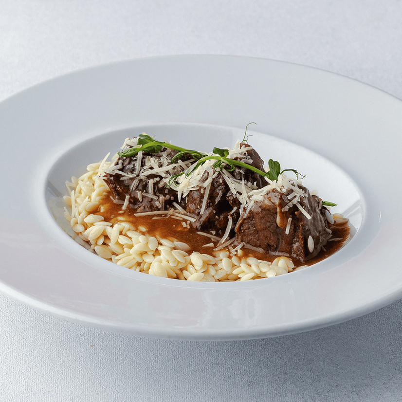 Під соусом демігляс та з гарніром на вибір: паста рисіні або картопляним пюре