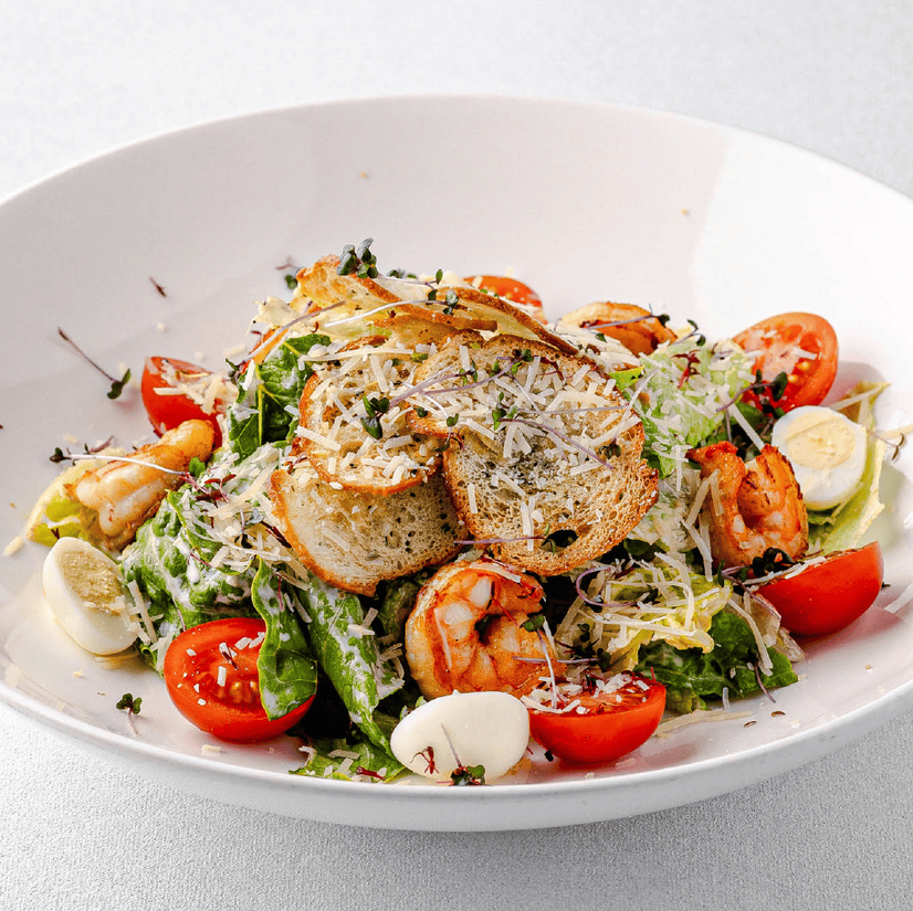 салат айсберг, салат ромен, томати чері, перепелині яйця, смажені тигрові креветки, фірмовий соус, сир пармезан, грінки