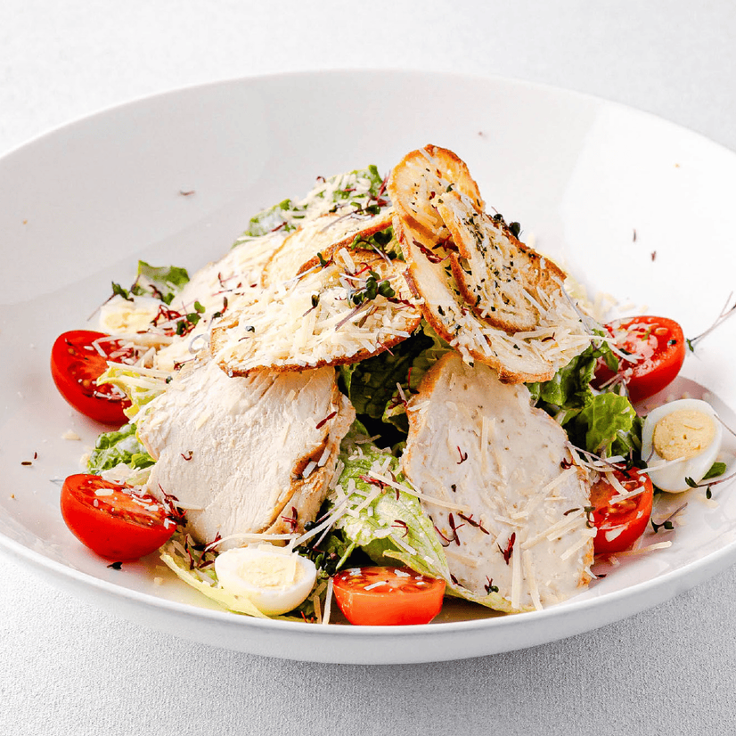 салат айсберг, салат ромен, томати чері, перепелині яйця, грильоване куряче філе, фірмовий соус, сир пармезан, грінки