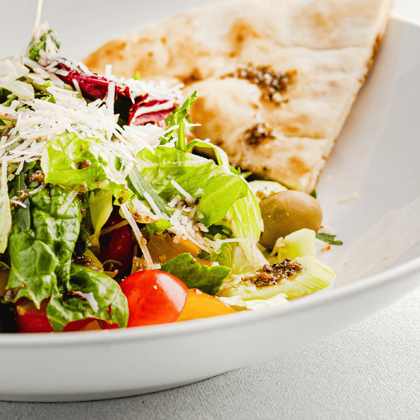 Мікс салатів, оливки, маслини, помідор Черрі, огірок, болгарський перец, оливкова олія, соус бальзамічний, сир Пармезан, подається з фокачча