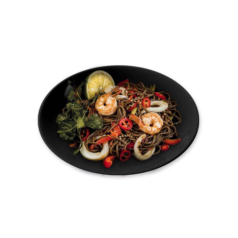 хвости тигрових креветок, кальмар, мікс овочей, цибуля червона, перець чилі, гречана локшина, кінза, кунжут, лайм, соус соєвий, соус кисло-солодкий
