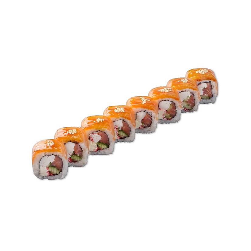 лосось, сьомга холодного копчення, сир Філадельфія, сніжний краб, ікра тобіко, огірок, соус унагі, кунжут
