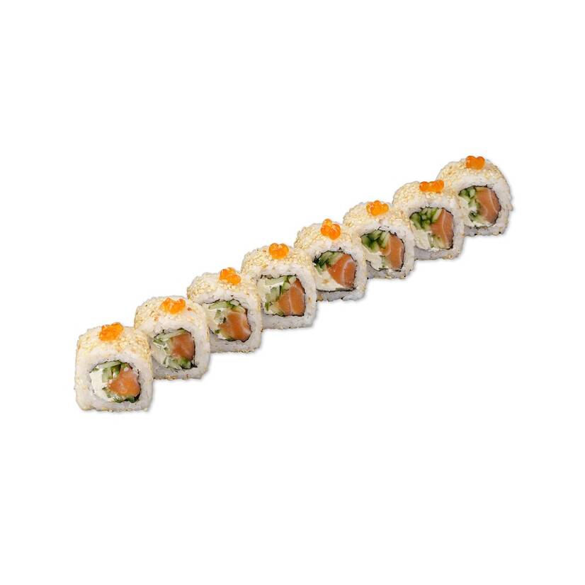 лосось, сир Філадельфія, ікра червона, огірок, кунжут