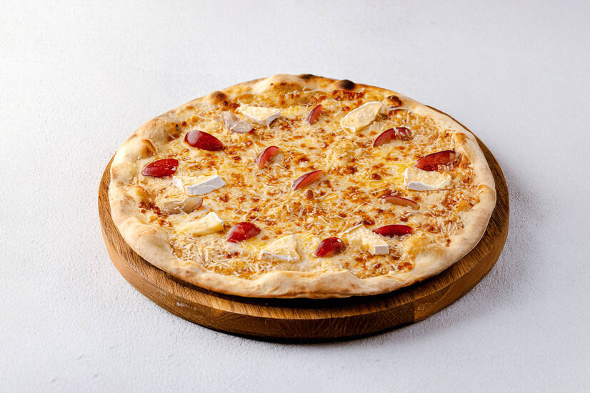 з сирами: камамбер, пармезан, моцарела, радомер, дорблю і виноградом. На фірмовому білому соусі чи на песто.