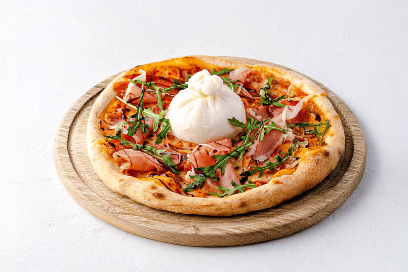 буррата, прошутто, моцарела, помідори чері, рукола, крем-бальзамік, на соусі Марінара