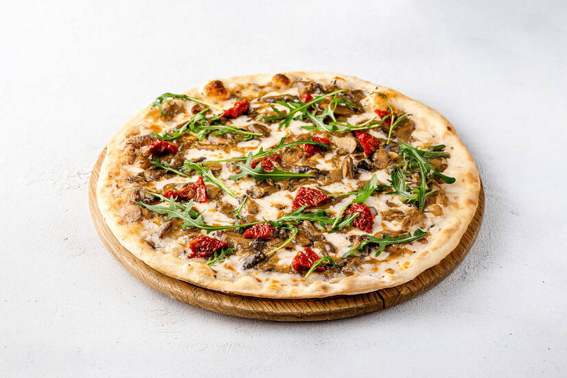лисички, гливи, печериці, маслюкі, білі гриби, моцарела, трюфільна олія, вялені томати, на вершково-трюфельному соусі