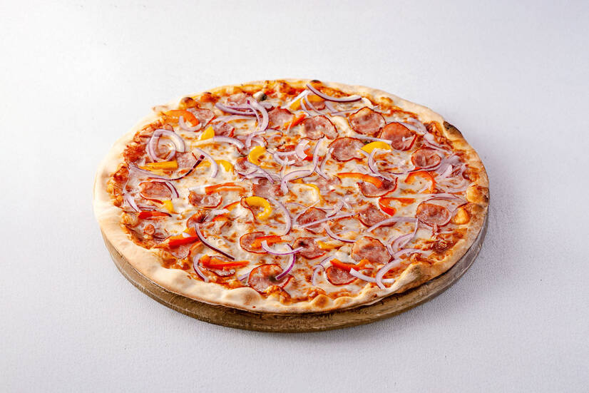 домашня ковбаса, болгарський перець, маринована цибуля, печериці, сир моцарелла, на фірмовому томатному соусі