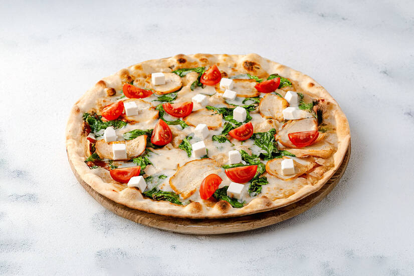 куряче філе гриль, шпинат, сир фета, помідори чері, сир моцарела на фірмовому білому соусі.