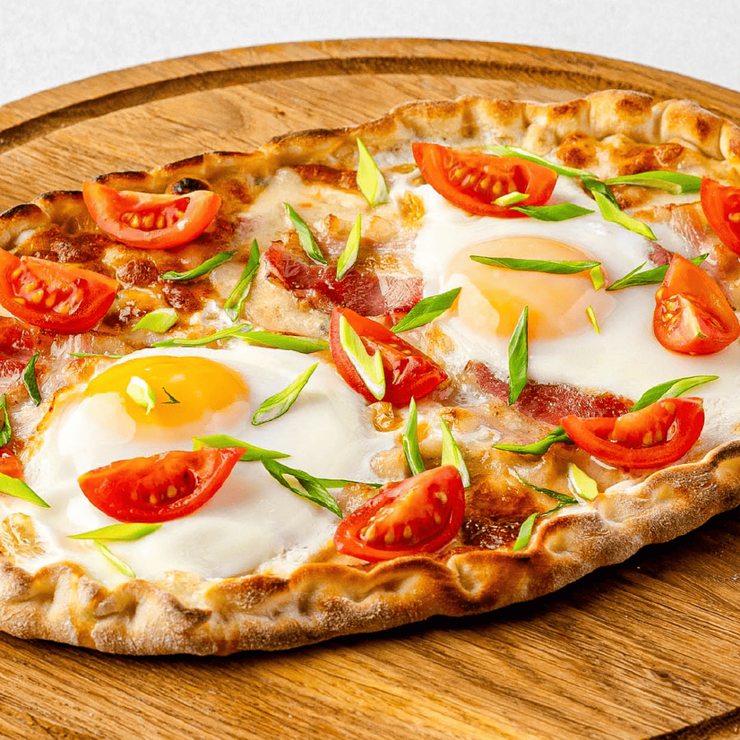 з беконом, яйцями та сиром моцарелла, на фірмовому білому соусі